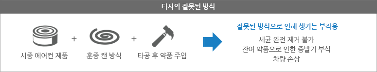 How?시중에서 흔히 이용되는 캔, 거품 등의 훈증 방식이나 타공(구멍 뚫음)을 통해 약품만 주입하는 시공은 임시처방일 뿐